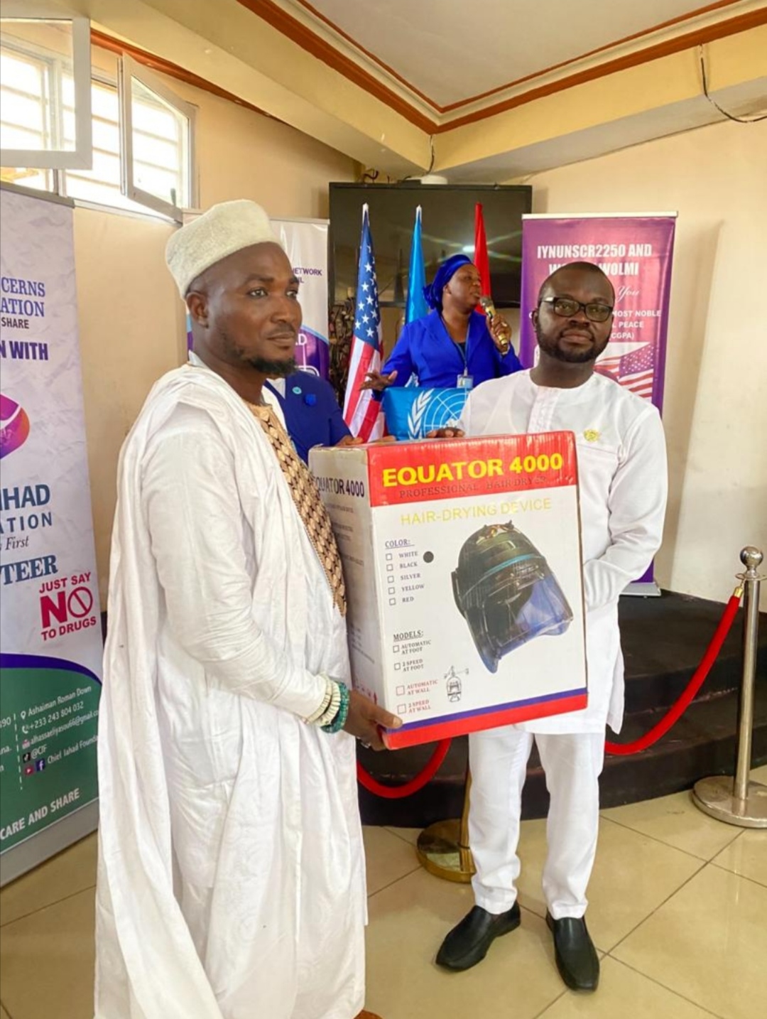 During the ceremony, Her Excellency Rev. Dr. Lilian Sally Addo, Commander of the Most Noble Order of Global Peace Ambassador and a leading figure of the International Youth Network for UN Security Council Resolution 2250 (IYNUNSCR), presented an Equator 4000 Professional Hair Dryer to Dr. Wemakor.
